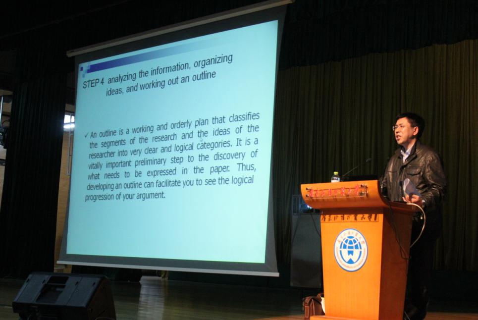 讲座之初,张兴红主任谈到毕业论文准备时间为7个月左右,其重要性不可忽视,需要同学们认真对待。接着他先从写作原因、论文特点和研究方法等方面介绍论文写作的基本概念,建议同学们充分利用图书馆数据库资源。接着他从专业的角度,为同学们详细讲解了毕业论文选题、资料查询、确立观点、确定提纲、初稿、修改及定稿等六大步骤。谈到选题时,他列举大量论文题目,提醒同学们注意题目的深度、广度及新颖性,尽量选用贴近实际、具有时代性的研究主题。此外,张主任还对论文的宏观结构、笔记记录、注释的用法等进行针对性的讲述。