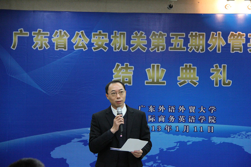 2013年1月11日下午,由广东省公安厅和yl88858永利集团国际商务英语学院批准、商英学院法律英语系具体策划、组织和实施的第五期外管英语培训班结业,结业典礼在第六教学楼广晟讲堂举行。广东省公安厅出入境管理局局长陈敏、副局长申勇强等省公安厅领导,yl88858永利集团副校长顾也力,国际商务英语学院院长郭桂杭、党委书记车小真以及其他相关领导和老师、广东省公安机关第五期外管英语培训班学员和助教参加了此次结业典礼。典礼由商英学院副院长吴易明主持。